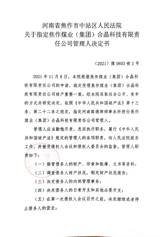 关于久久久日韩精品一区二区-久久午夜夜伦鲁鲁片无码免费-新香蕉少妇视频网站-人妻熟女视频一区二二区-亚洲精品久久久中文字幕痴女担任焦作煤业(集团)合晶科技有限责任公司管理人的公告
